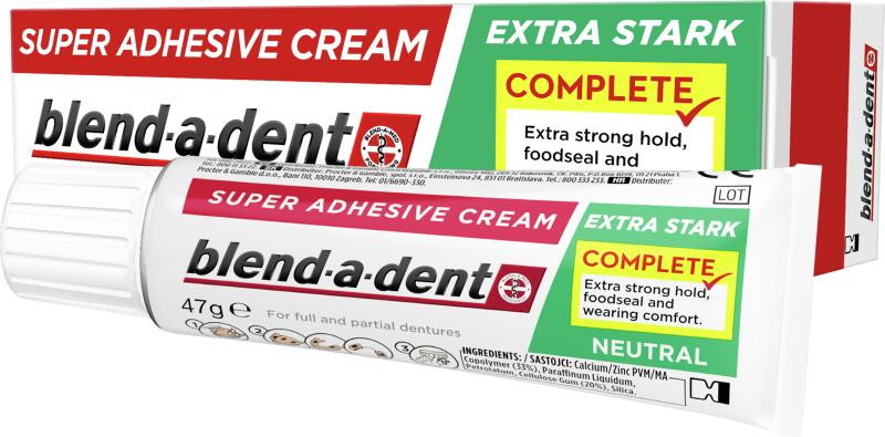 A Blend-a-dent Complete egész napon át erős rögzítést biztosít, a fogíny és a műfogsor közötti rést kitöltő rétegnek köszönhetően pedig kényelmes műfogsorviseletet kínál, illetve megakadályozza az ételdarabkák behatolását a műfogsor alá.