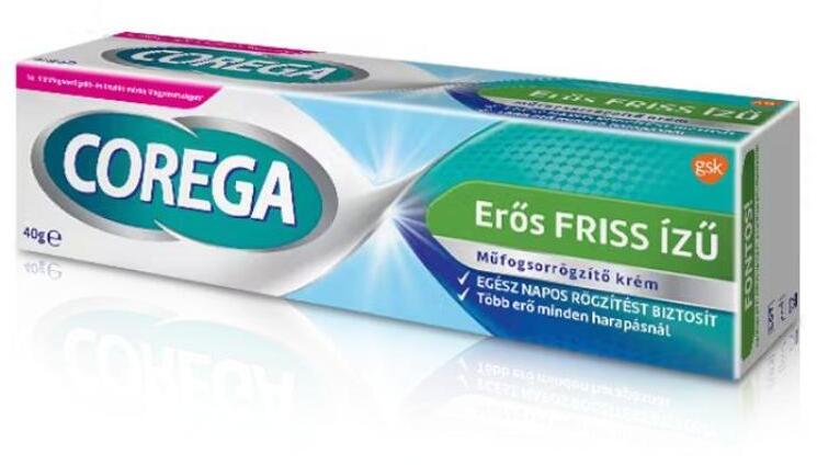 2. Vigyen fel egy kis mennyiségű Corega Erős Friss ízű ragasztót rövid csíkokban, ne túl közel a műfogsor peremeihez.