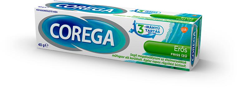 A Corega Erős Friss ízű műfogsorrögzítő krém a Corega cinkmentes műfogsorrögzítő termékcsaládjának tagja, amely különleges összetételének köszönhetően egész napos rögzítést biztosít, extra friss mentolos ízzel.