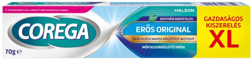 A Corega Erős Original erős, egész napos tartást biztosít akár 38%-kal nagyobb harapóerővel, hogy biztonságosan a helyén tartsa a műfogsort és megadja az ön számára a magabiztosságot kedvenc ételei fogyasztásához.